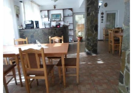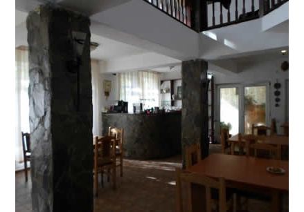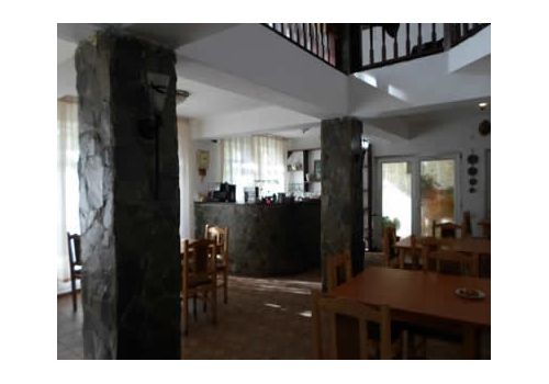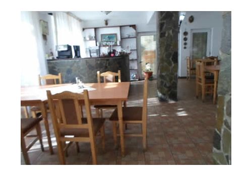 Salon de luat masa cu 100 de locuri, avand doua intrari; una dinspre receptie si alta dinspre terasa acopeita, unde exista un semineu, bar placate cu piatra de granit..