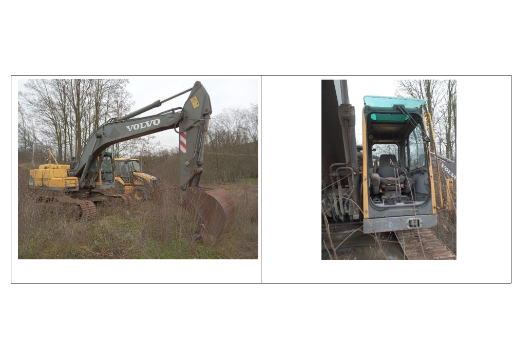 Excavator pe şenile marca Volvo EC 210 BLC, serie 20329/2006, an fabricaţie 2006, capacitate cilindrică: 5,7 l – D6DEFE2, greutate: 21.300 kg, putere motor: 107 kw brut/143 cp, lăţime şenile: 600 mm, viteză maximă: 5,50 km/h, capacitatea cupei: 1,03 mc, forţa de săpare: 113 Kn, adâncime maximă de săpare: 6380 mm, raza maximă de acţiune: 9600 mm-9990 mm, serie de identificare: EX210V20329